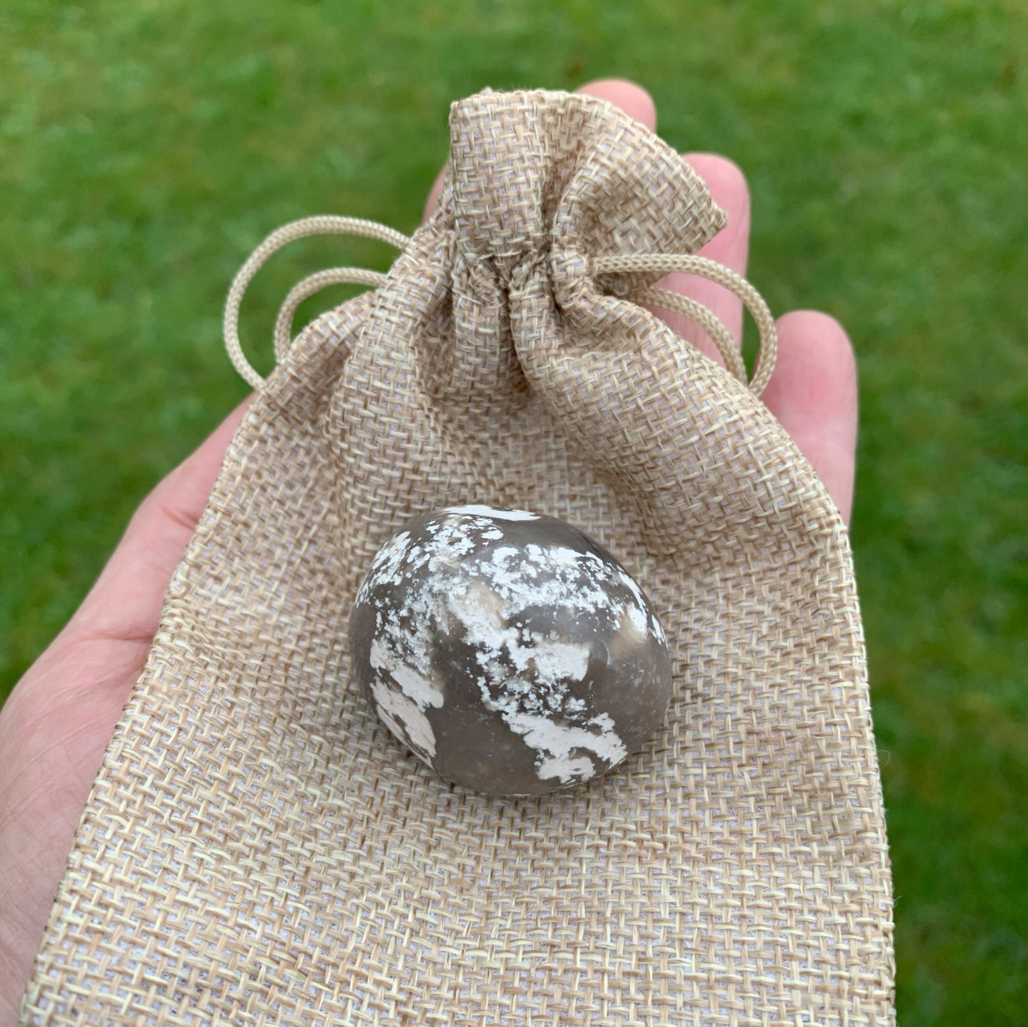 Der medfølger en lille naturfarvet sæk med snørelukning, lige som på billedet.
