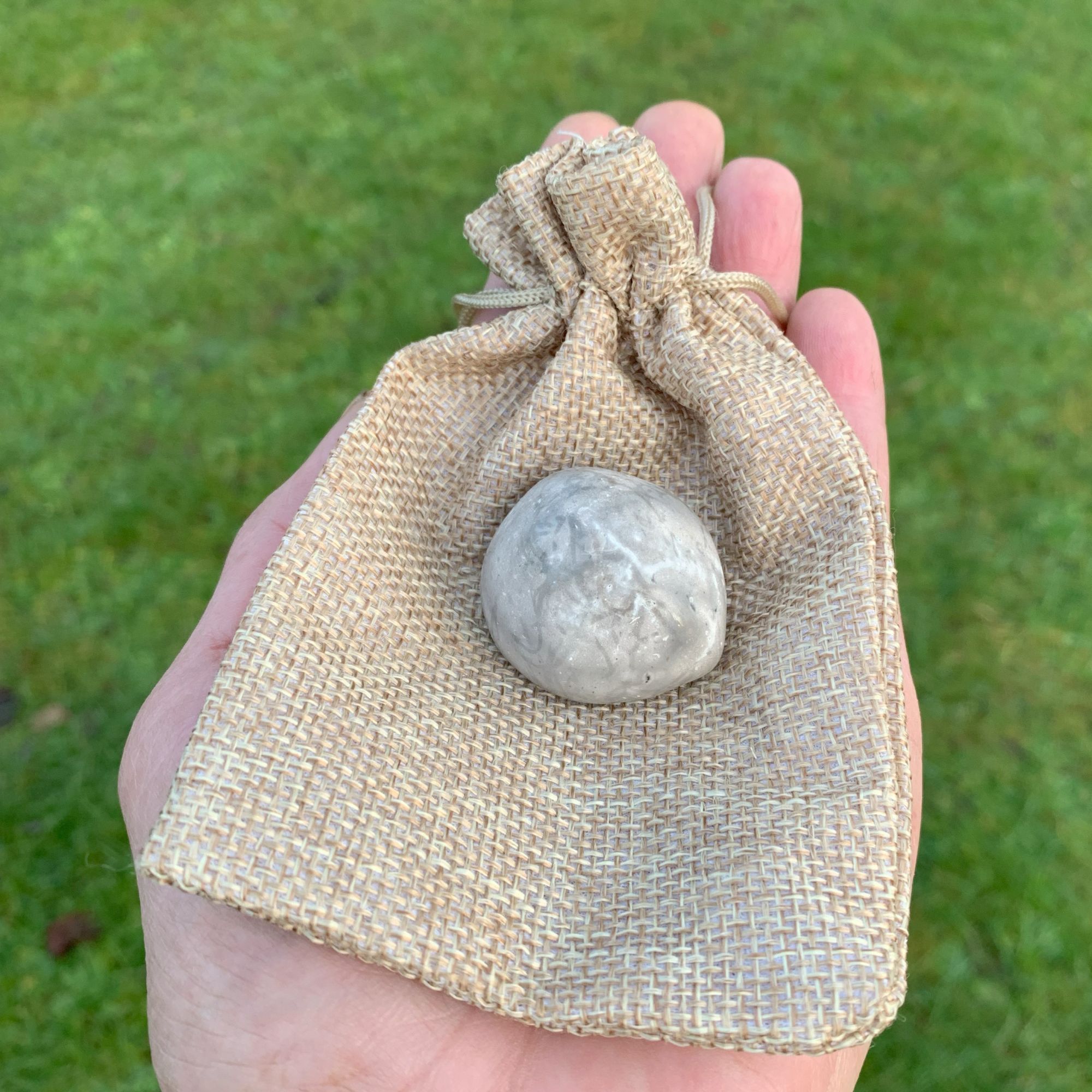 Der medfølger en lille naturfarvet sæk med snørelukning, lige som på billedet.