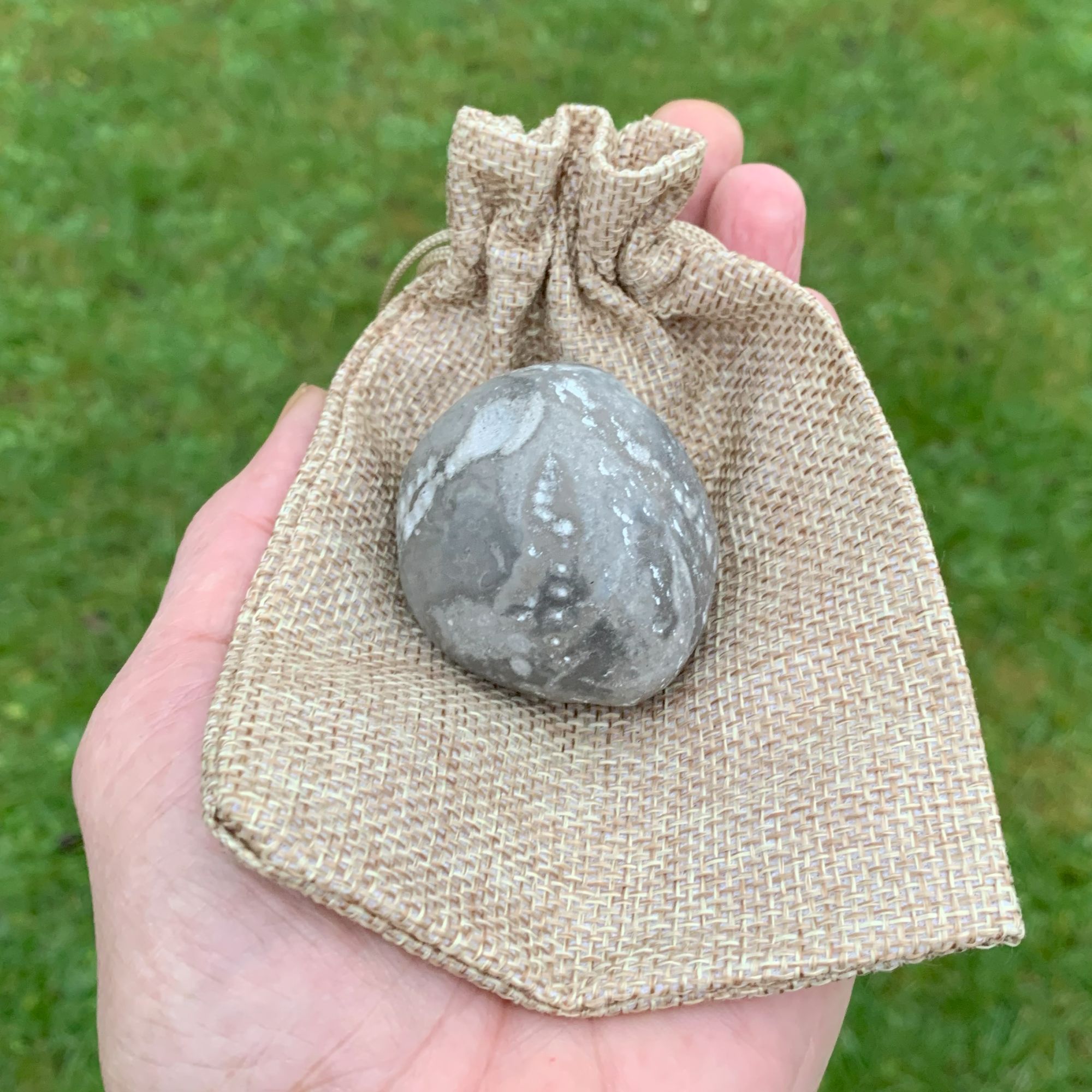 Der medfølger en lille naturfarvet sæk med snørelukning, lige som på billedet.
